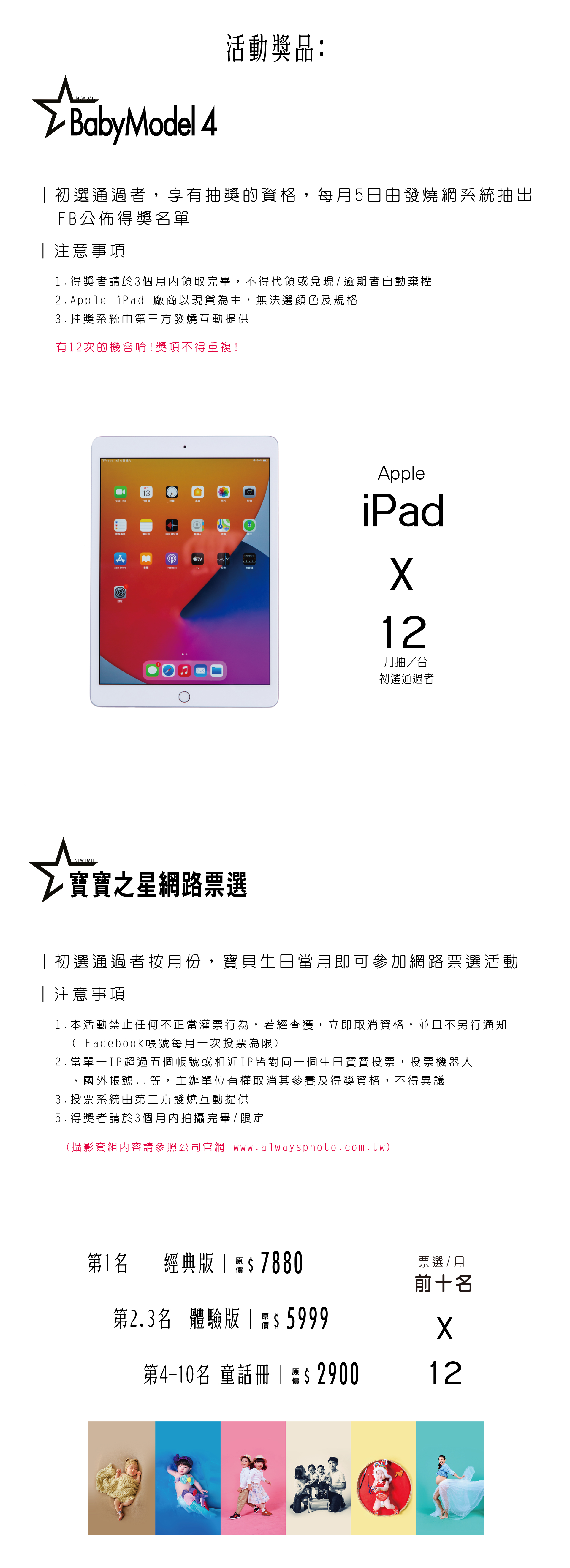 ▎寶寶之星票選活動(需通過初選),前十名者獲得免費拍攝經典版套組、體驗版套組等共120名獎項