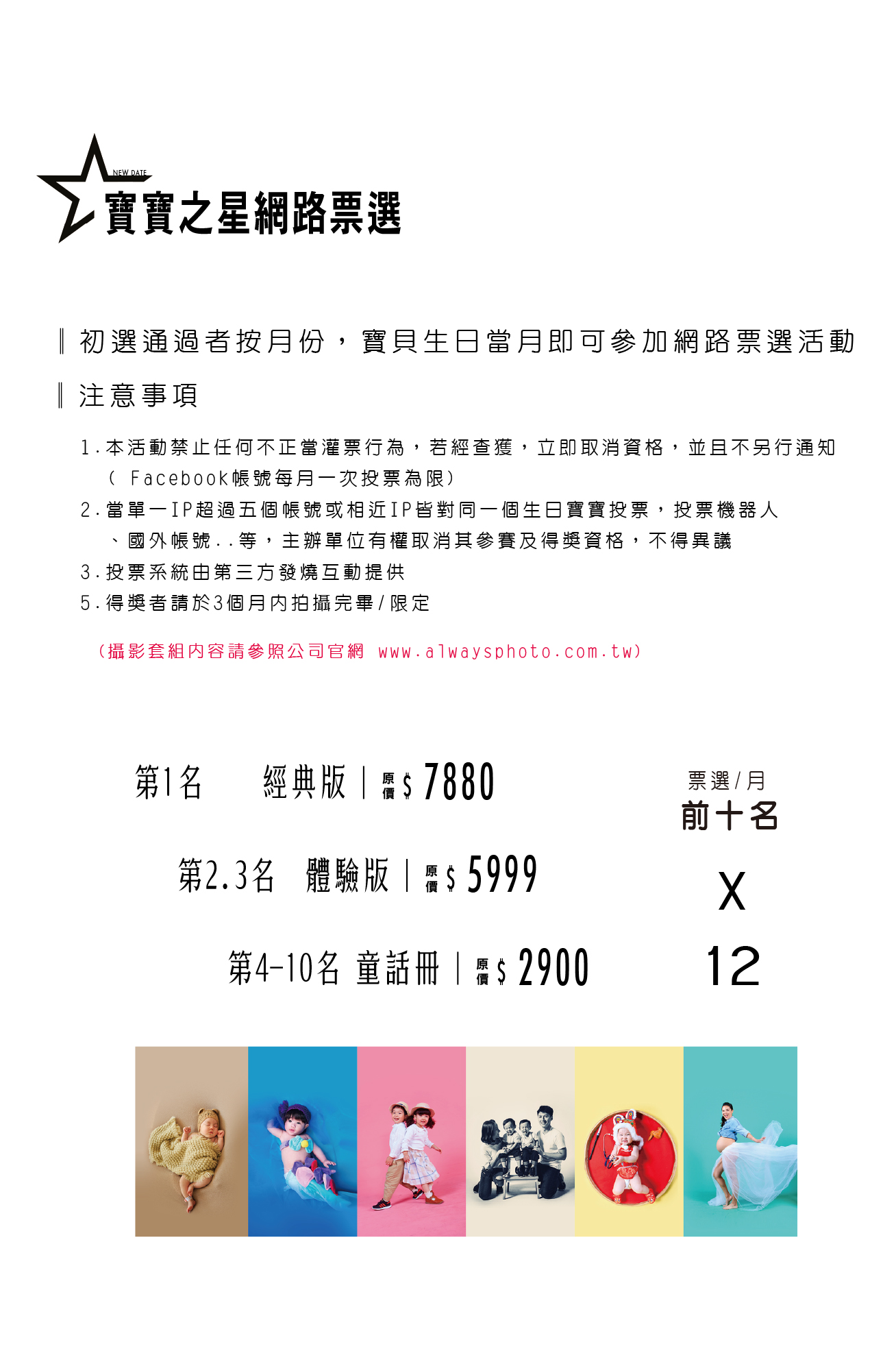 通過初選的寶寶們,我們在寶貝生日當月,於官網舉辦【寶寶之星票選】活動、每個月舉辦一次(2021年6月~2022年5月),隔月五日於粉絲團公佈得獎名單為寶貝慶祝生日的同時,邀請親朋好友一起投票拿贈品!(需有FB帳號、每月限投一次) 票數前10名,可以贏得免費拍攝[寶寶寫真+親子全家福]經典版、體驗版等獎項每月10名共120名