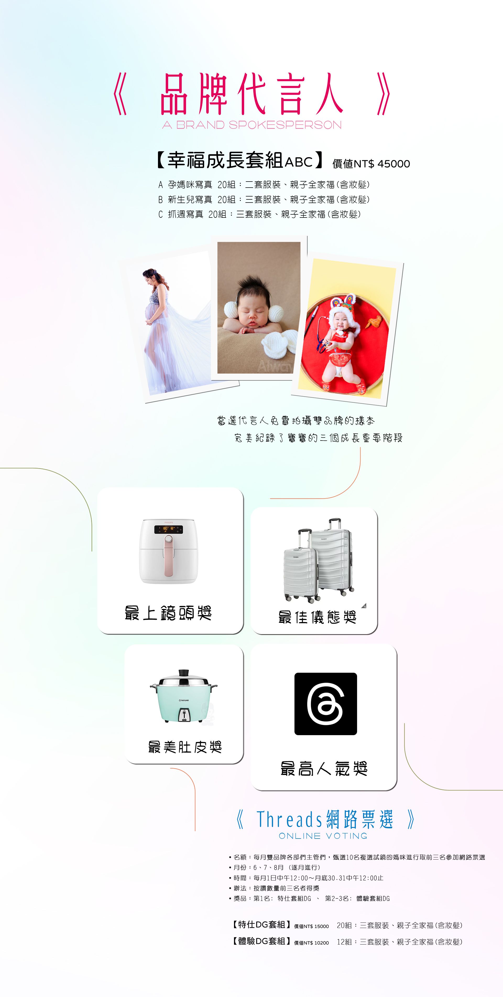 獲選前三名的媽咪,將成為雙品牌 2026 年度的形象代言人。這不僅是一份榮耀,更是妳送給孩子最特別的見面禮「幸福成長三套組」週歲前拍三次,我們不只陪妳度過孕期,更完整記錄妳與孩子未來的三個重要時刻。(孕媽咪寫真、新生兒寫真、抓週寫真+親子全家福)