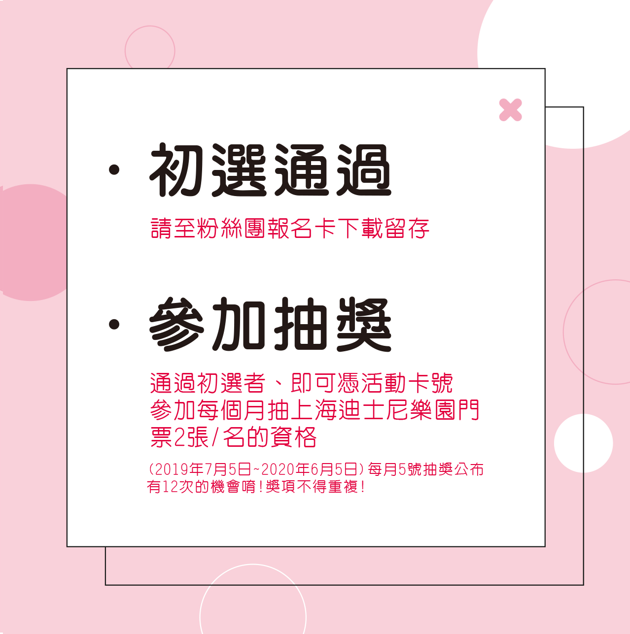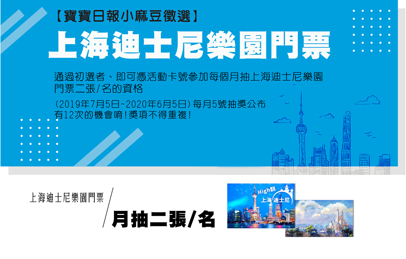 寶貝報名資料送出後,請加LINE核對資料,等候有無通過初選、初選通過會LINE通知並請至粉絲團下載報名卡留存!即取得參加7月開始,每個月五號的「上海迪士尼樂園門票2張/名」抽獎活動(2019年7月5日~2020年6月5日),共有12次的得獎機會!(獎項不得重複),也請耐心等待寶貝有無通過複選及試鏡的機會唷!