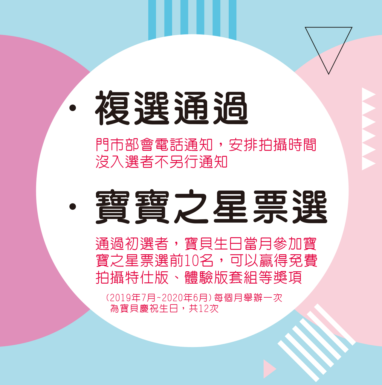 通過初選的寶寶們,我們在寶貝生日當月,於官網舉辦【寶寶之星票選】活動、每個月舉辦一次(2019年7月~2020年6月),為寶貝慶祝生日的同時,邀請親朋好友一起投票拿贈品!(需有FB帳號、每月限投一次) 票數前10名,可以贏得免費拍攝[寶寶寫真+親子全家福]特仕版、體驗版等獎項每月10名共120名
